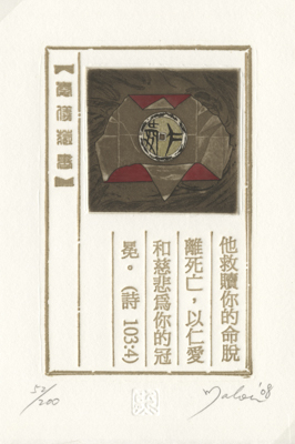 Artist: 藝術家: CHENG, Taigo鄭大戈Owner: 票主: Hong Kong Ex-Libris Association 香港藏書票協會Collector: 收藏者 / 機構: Hong Kong Baptist University Library香港浸會大學圖書館
