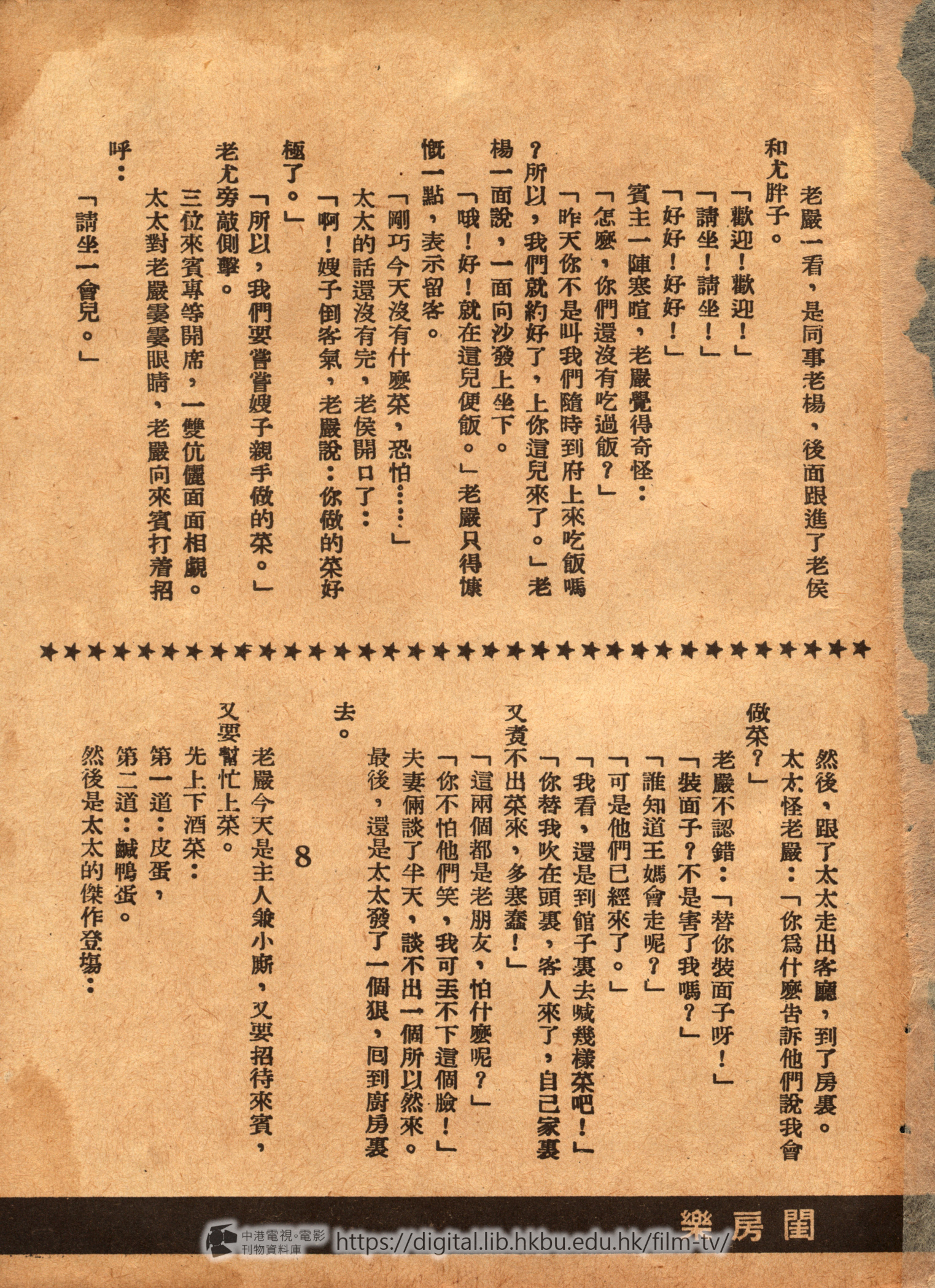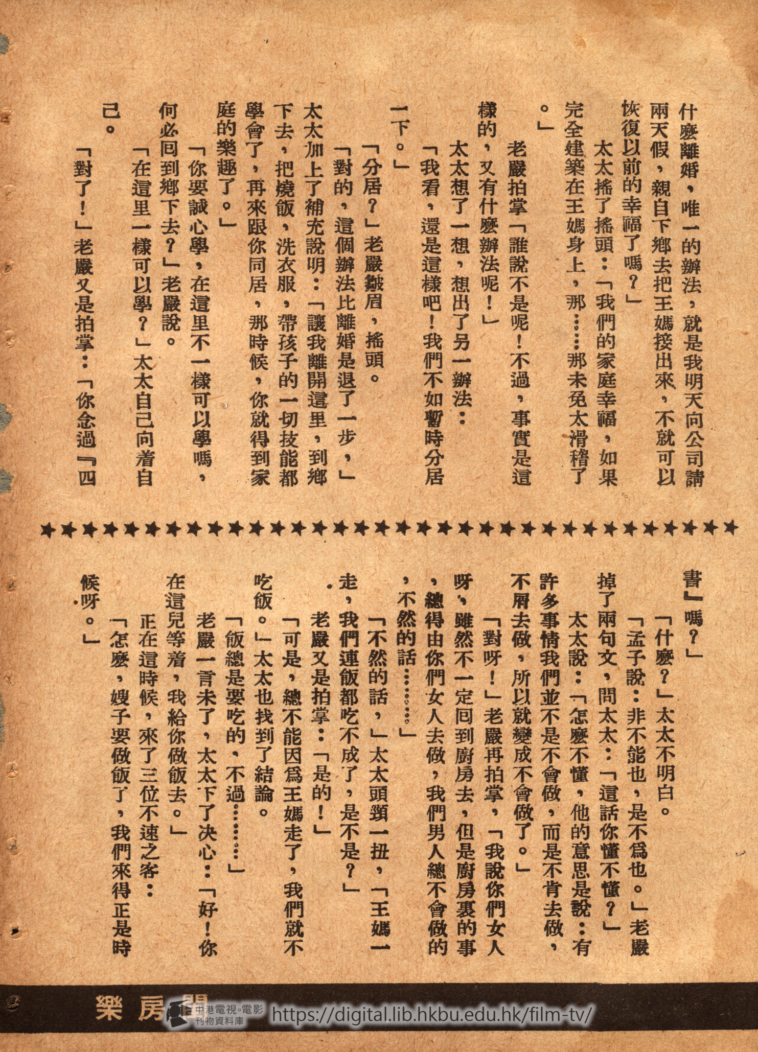 老嚴把工作日程表安排了一下:「一淸早起來,升煤爐,燒開水,煑稀飯,上街買菜,囘家做飯,洗衣服,做針綫,晚上還要帶孩子睡覺,這許多工作,我看除了王媽,祗怕誰也做不了……」