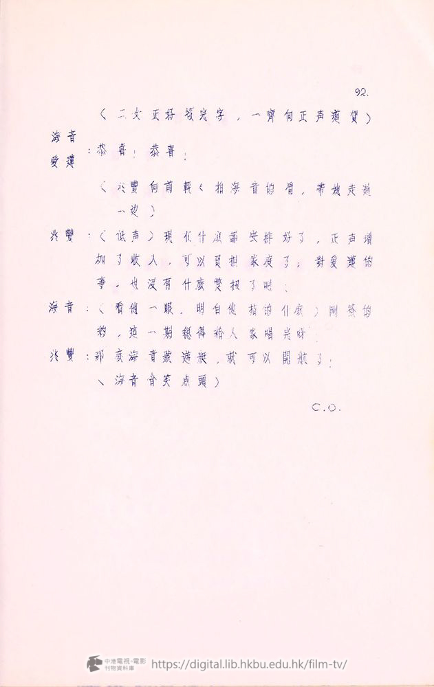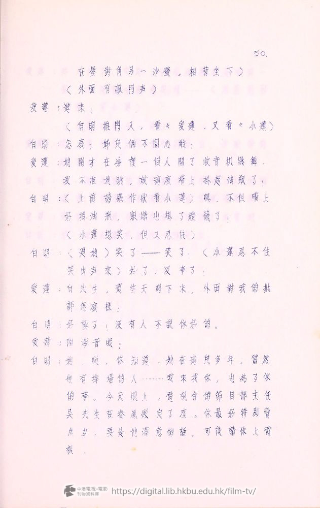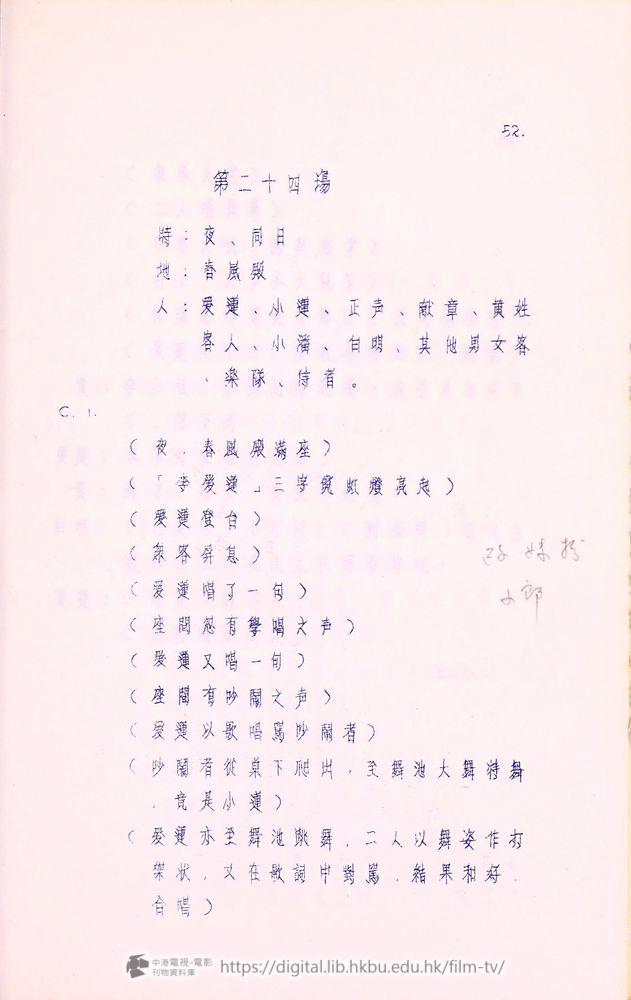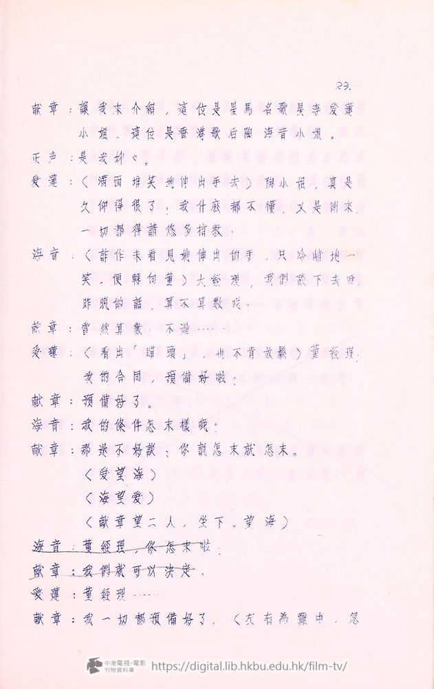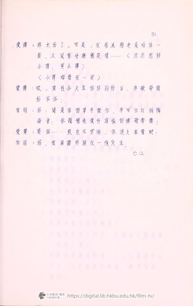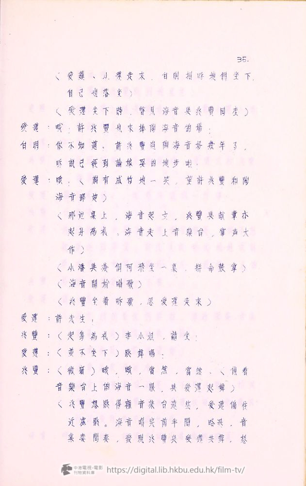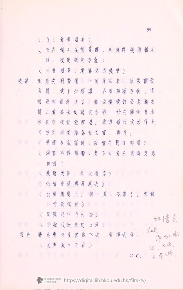 爰蓮:我這次到香港,一佪月以來,承䝉諸位爰護,我十分感激。合同期滿以後,我就要囬南洋去了!諸位對我的好意和友情,我会永遠記在心裡!好在陶海音小姐在這裡継续献唱,她的歌比我好得多,可以長期的給各位欣賞,再見!