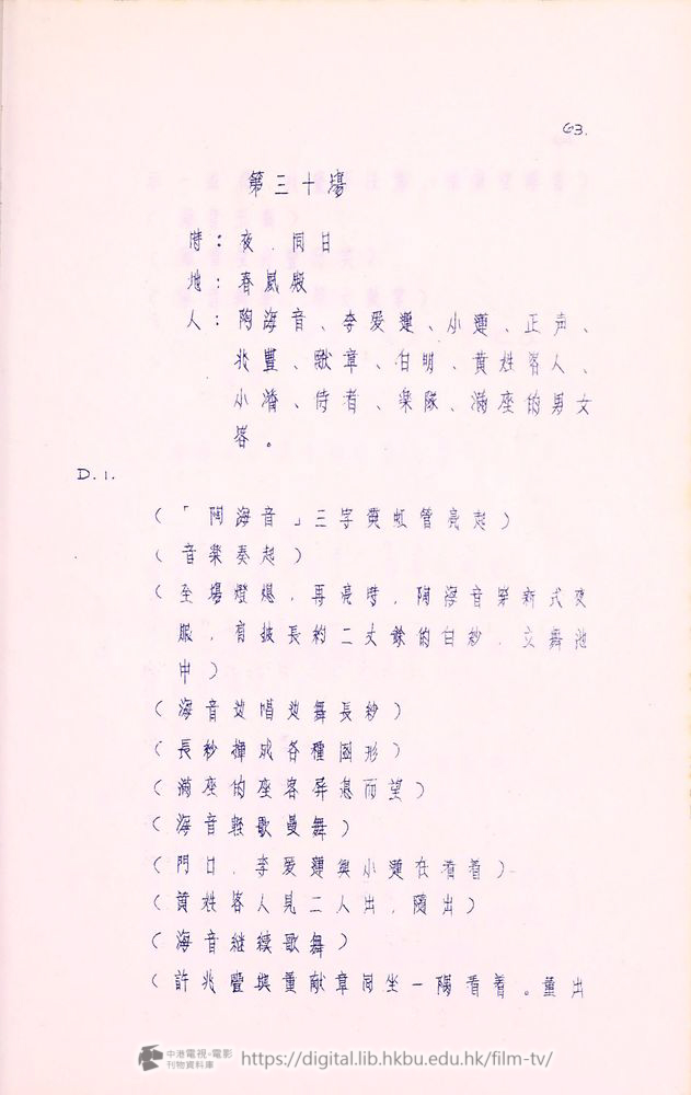 人:海音、爰蓮、正声、兆豐、献章、小蓮、小潘、白明、陶母、陶小弟、陶小妹及其他演員、楽隊人員、賓客、僕役等。