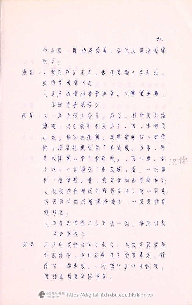 献章:(X笑立起)好了,好了,別叫正声為難吧!我已経早有安排了,陶、李两位小姐,都不必推讓,我要請两位一齊帮忙;酒店裡現在除「春風殿」以外,要另外開闢一佪「春華殿」,陶小姐,李小姐,一位請在「春風殿」唱,一位請在「春華殿」唱,我連合約都準備好了!