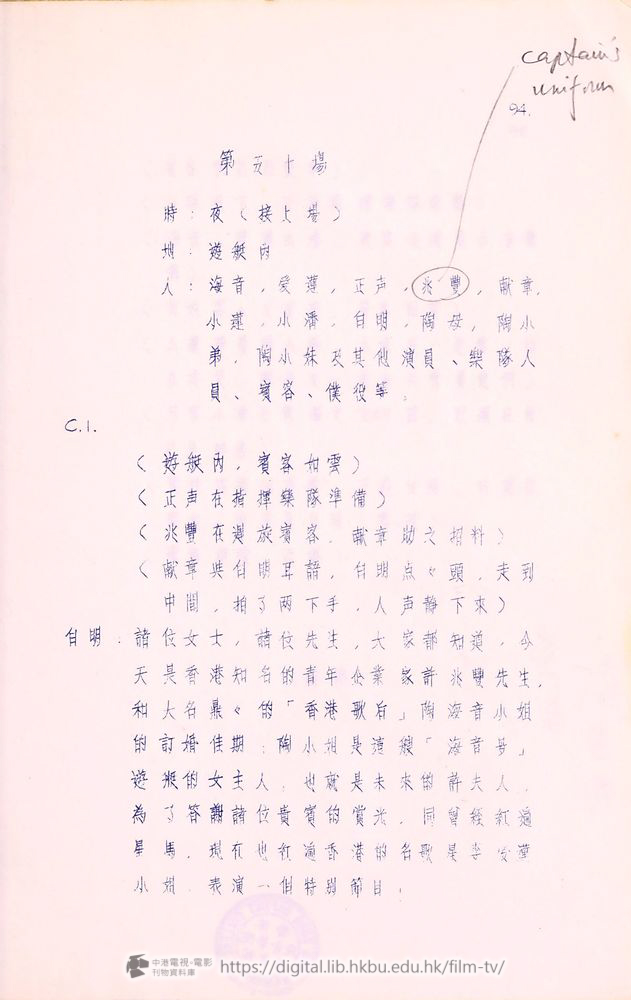 人:献章、正声、爰蓮、海音、兆豐、小潘、楽隊々員及其他客人、侍者等。