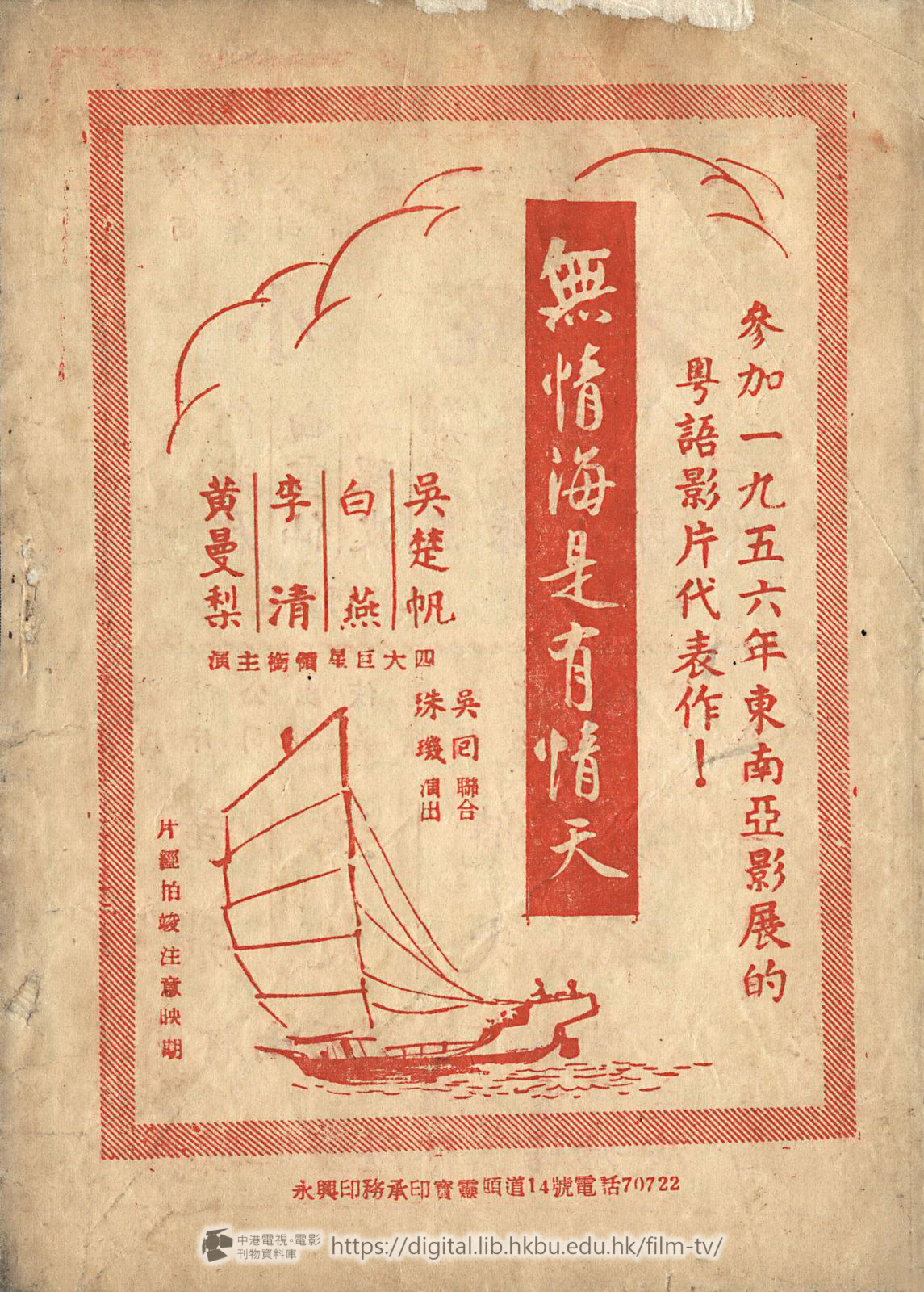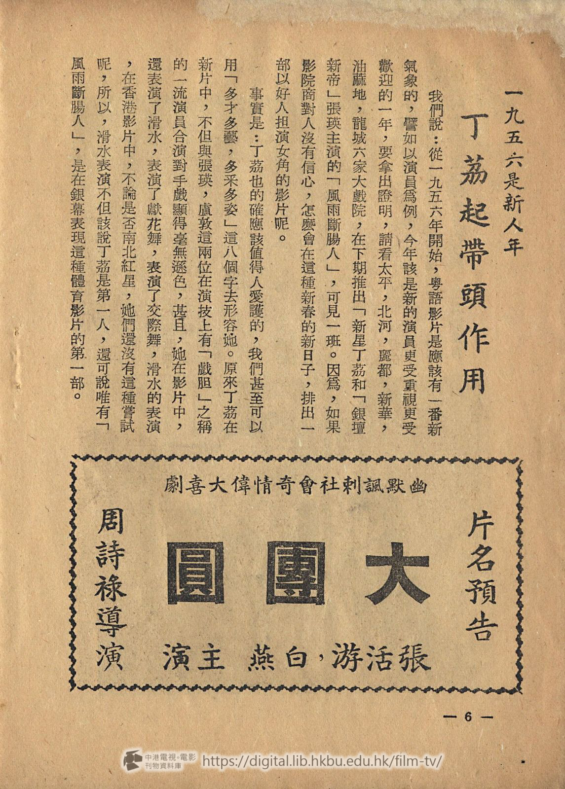 我們說:從一九五六年開始,粵語影 片是應該有一番新氣象的,譬如以演員爲例,今年該是新的演員更受重視更受歡迎的一年,要拿出證明,請看太平,北河,麗都,新華,油蔴地,龍城六家大戲院,在下期推出「新星丁荔和「銀壇新帝」張瑛主演的「風雨斷腸人」,可見一班。因爲,如果影院商對人沒有信心,怎麽會在這種新春的新日子,排出一部以好人担演女角的影片昵。