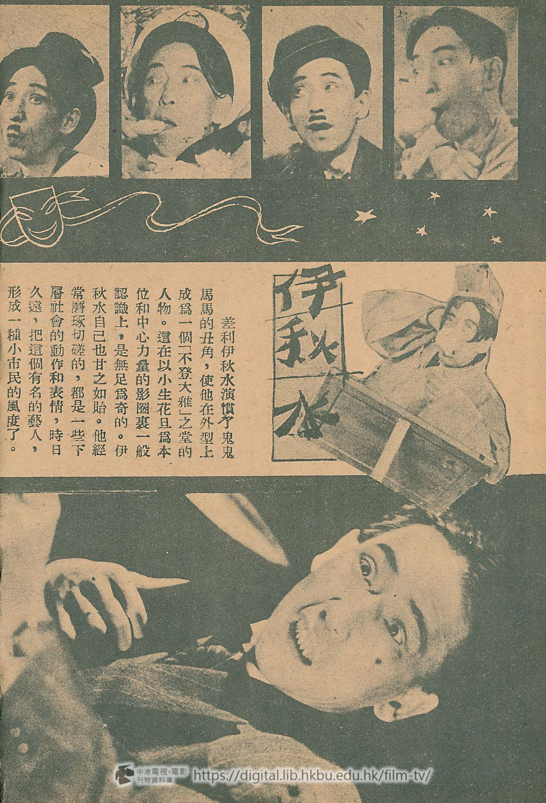 差利伊秋水演慣了「鬼鬼馬馬的丑角,使他在外型上成爲一個「不登大雅」之堂的人物。這在以小生花日一爲本位和中心力量的影圈裏一般認識上,是無足爲奇的。伊秋水自己也甘之如貽。他經常磨琢切磋的,都是一些下層社會的動作和表情,時日久遠,把這個有名的藝人,形成一種小市民的風度了。