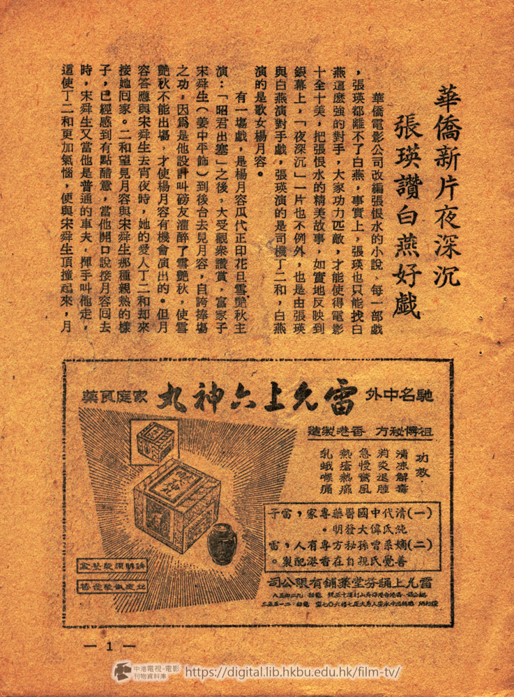 「夜深沉」,是華僑電影公司的新出品,也是根據張恨水的同名小說改編的,演員除了上述等人外,還有高魯泉,梁淑卿,司馬華龍,黃曼梨,李壽祺,李香琴,梁素琴,姜中平,黎灼灼等,陣容相當鼎盛。