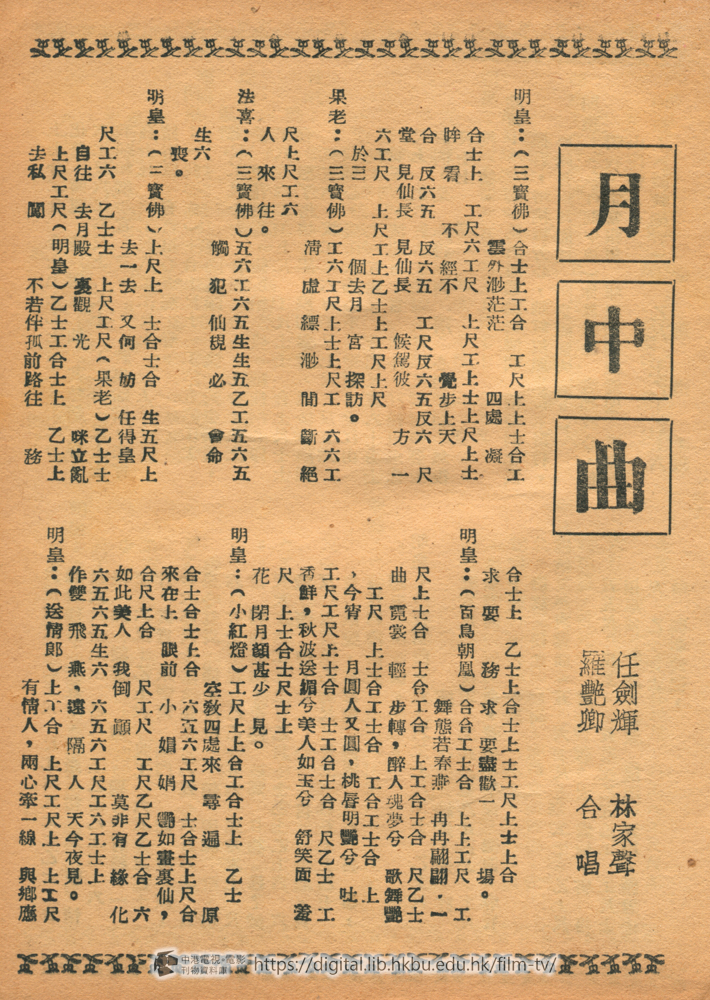 明皇:(反線歸時引子)苦不堪 食不盡,天宮深處覊囚萬歲君,滿胸悲憤誰個哀憫?意未遂,愛無能 但與嫦娥共結歡偶,雖死亦不驚震。