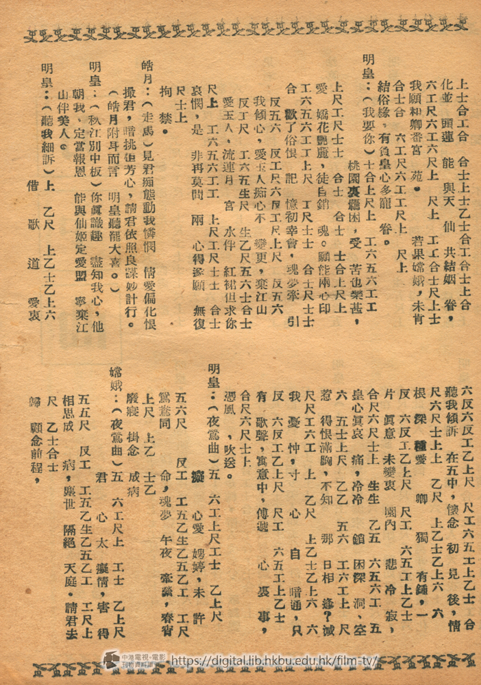 明皇:(食尾打轉反線七字淸)帝主癡情,誰似朕,甯甘受罪,報釵裙,安得食盡苦桃。完刼恨,誰料一桃摘落地,一桃生,代謝循環,無了盡,桃兒和淚,苦難呑,怪道多情,偏抱憾,唉心裏悲不禁,最是盈襟血淚印。