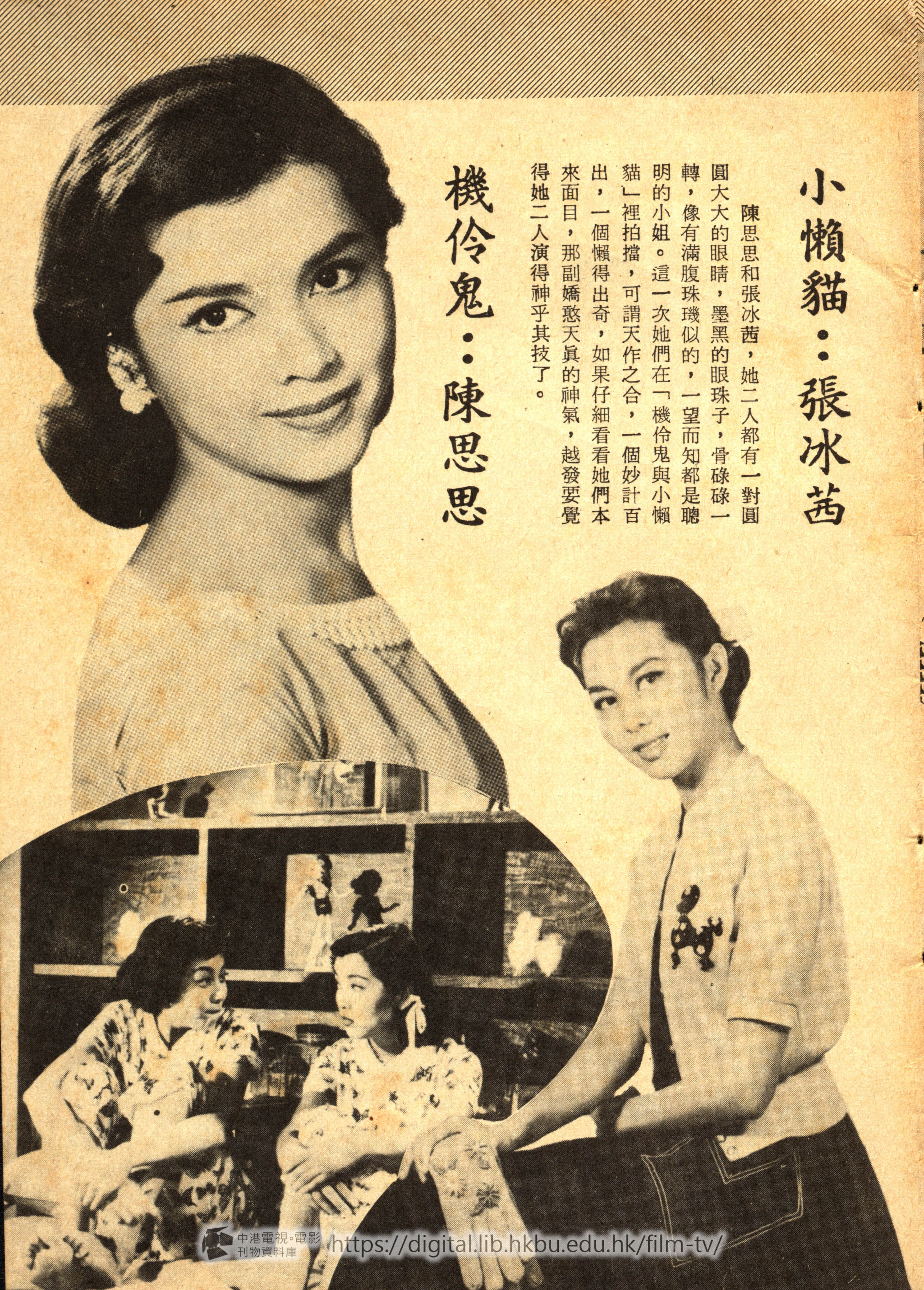 陳思思和張冰茜,她二人都有一對圓圓大大的眼睛,墨黑的眼珠子,骨碌碌一轉,像有滿腹珠璣似的,一望而知都是聰明的小姐。這一次她們在「機伶鬼與小懶貓」裡拍擋,可謂天作之合,一個妙計百出,一個懶得出奇,如果仔細看看她們本來面目,那副嬌憨天眞的神氣,越發要覺得她二人演得神乎其技了。