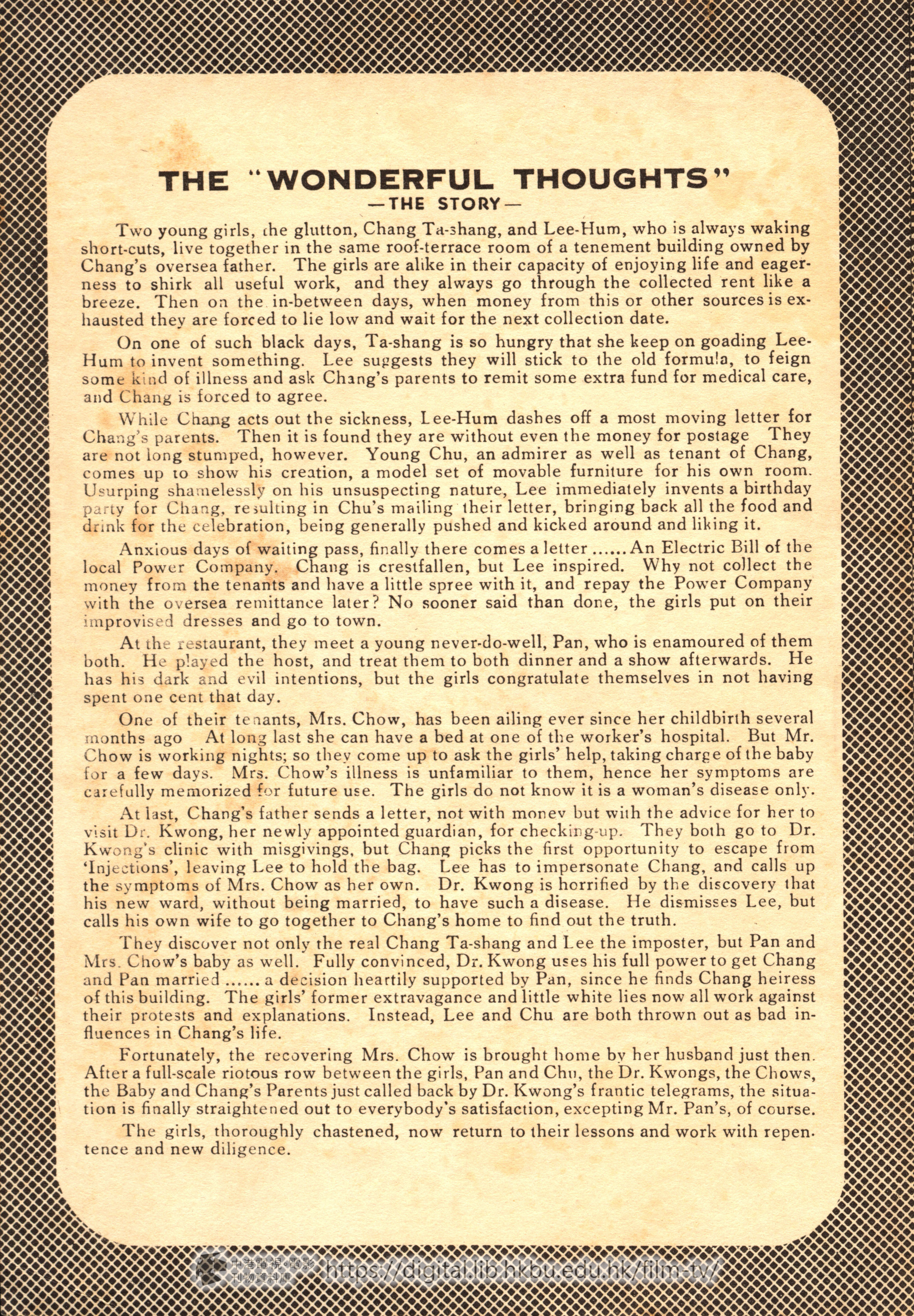 Two young girls, the glutton, Chang Ta-shang, and Lee-Hum, who is always waking short-cuts, live together in the same roof-terrace room of a tenement building owned by Chang’s oversea father. The girls are alike in their capacity of enjoying life and eagerness to shirk all useful work, and they always go through the collected rent like a breeze. Then on the in-between days, when money from this or other sources is exhausted they are forced to lie low and wait for the next collection date.