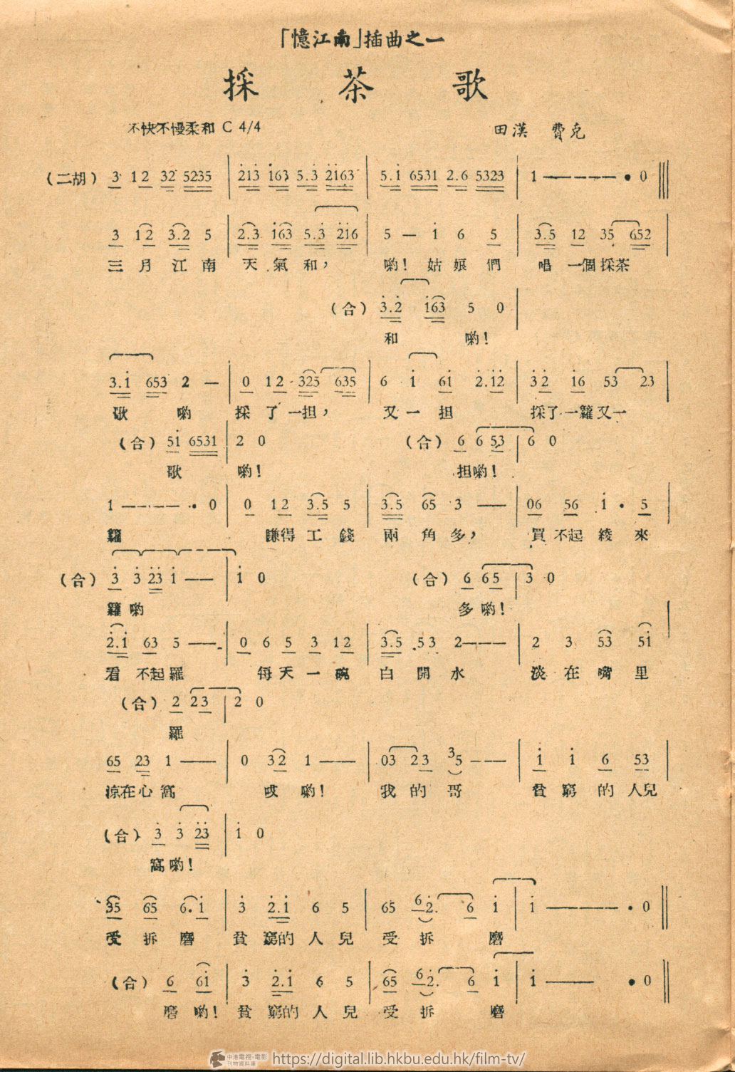 三月江南天氣和喲!(合)和喲!姑娘們唱一個採茶歌喲(合)歌喲!