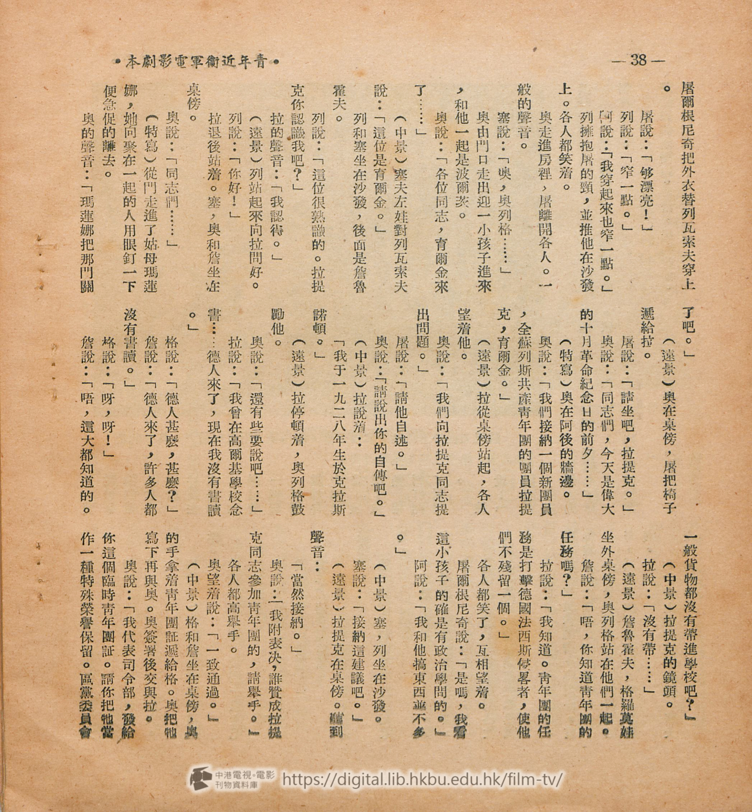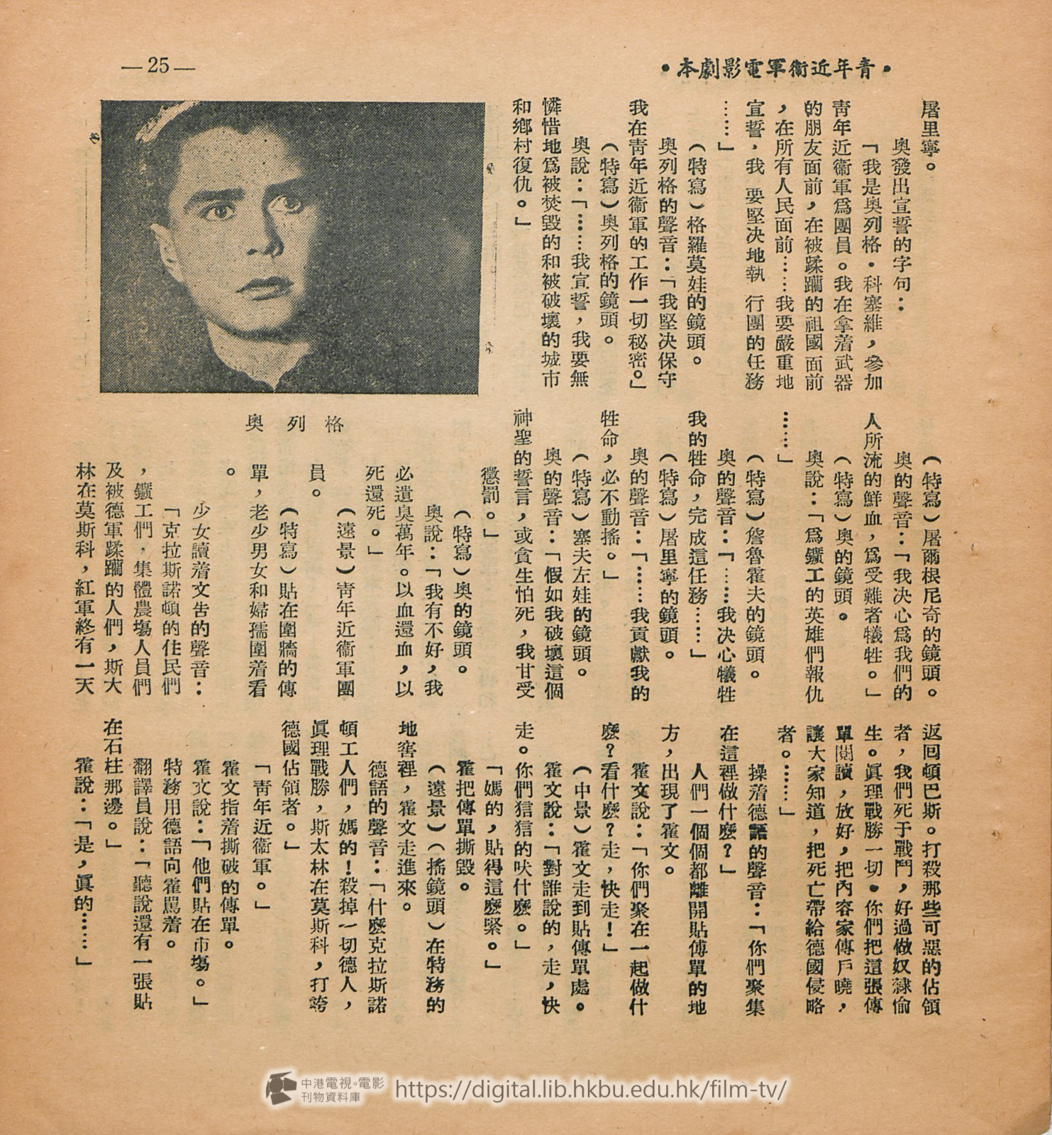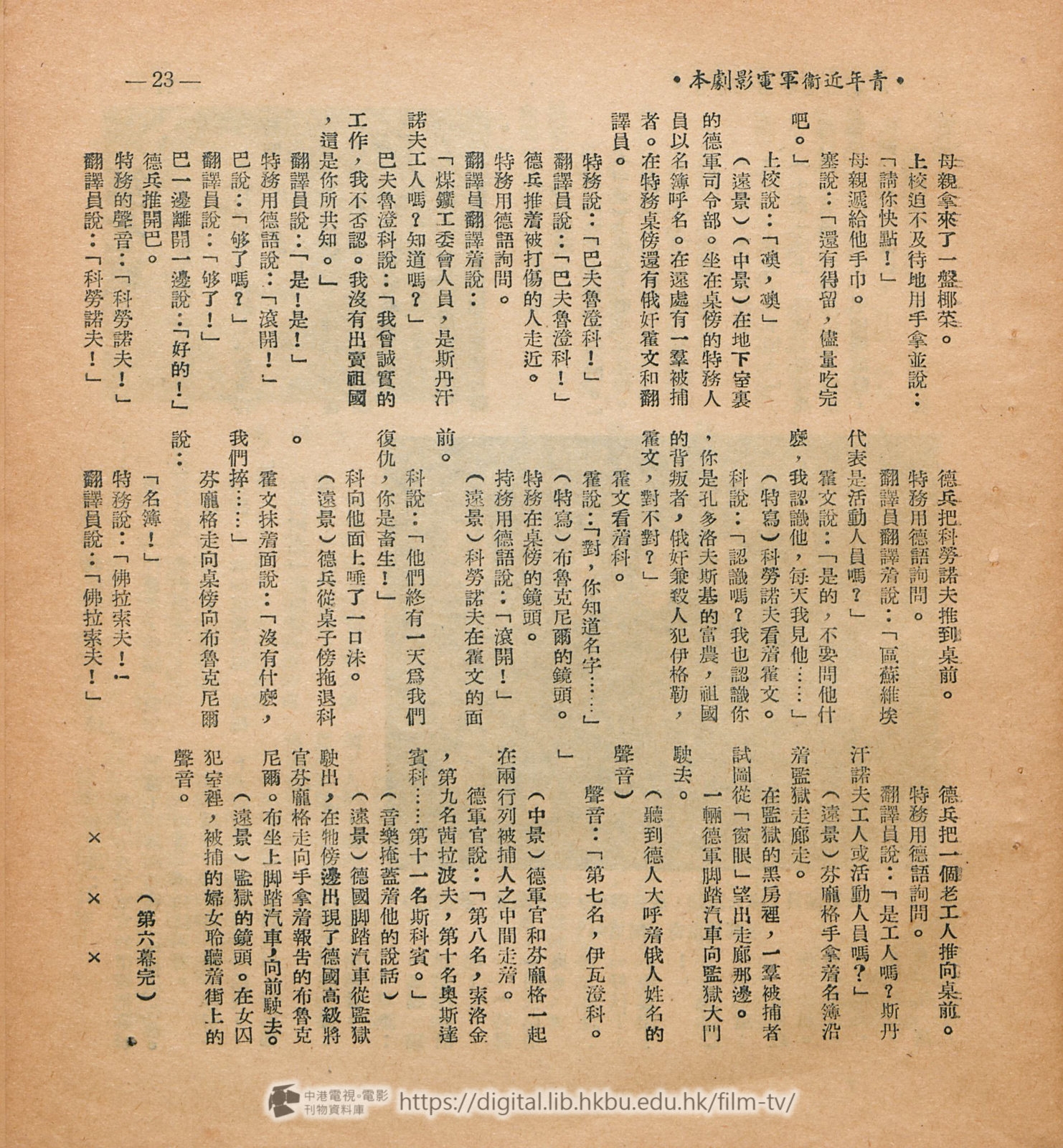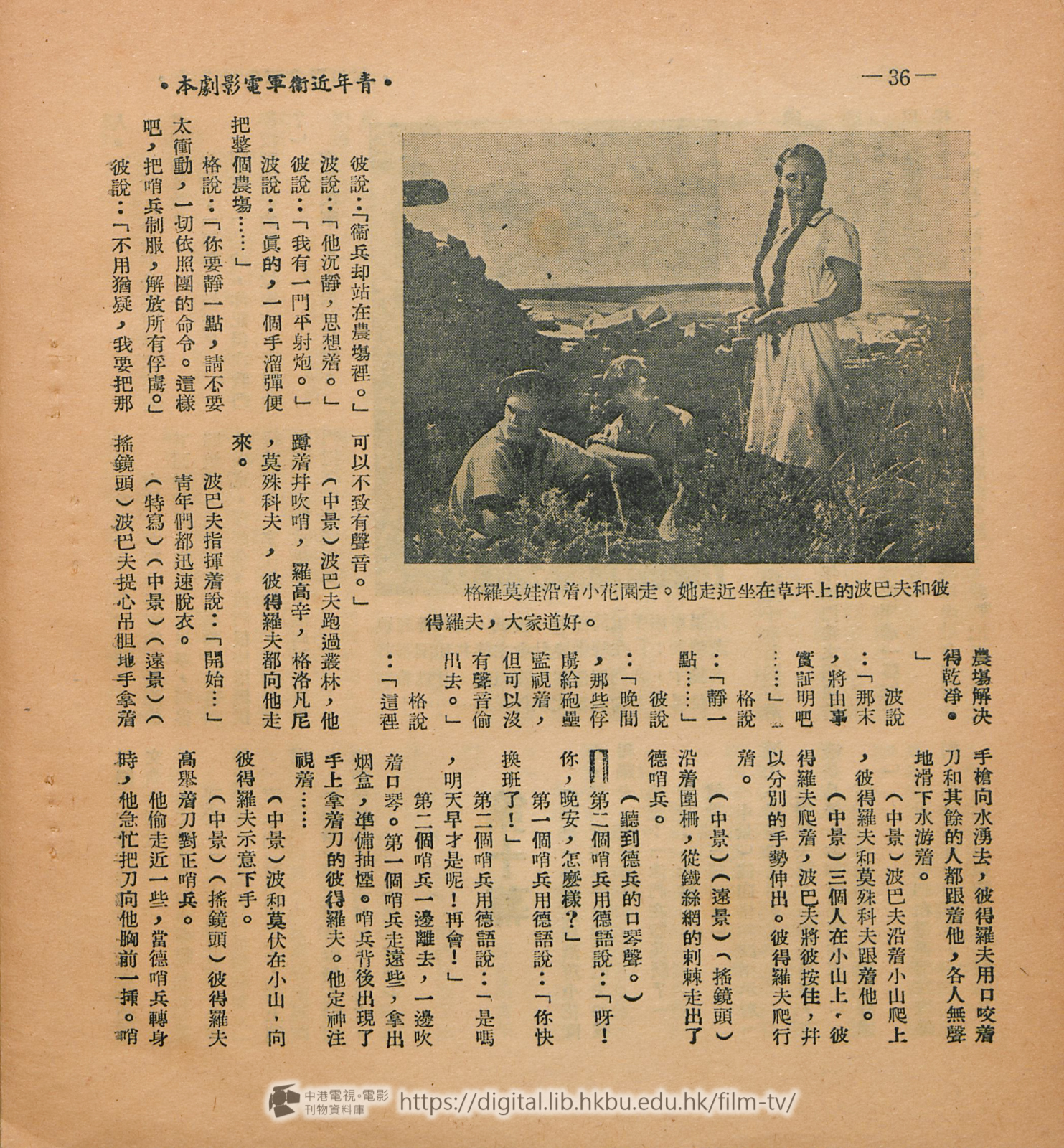 劇本每一段或毎一句話都是很有力和鼓勵人心的。但譯者得 聲明一下,本片的阈語拷貝是在莫斯科配音的,參加工作的是山東藉同志,所說出的對白未能完全與這狸譯出的相同,但譯者會儘力設法避免有極大的距離,經過三次的修改,使譯文和俄文原文及山東鄕土語氣的對白能够儘量減少差異。