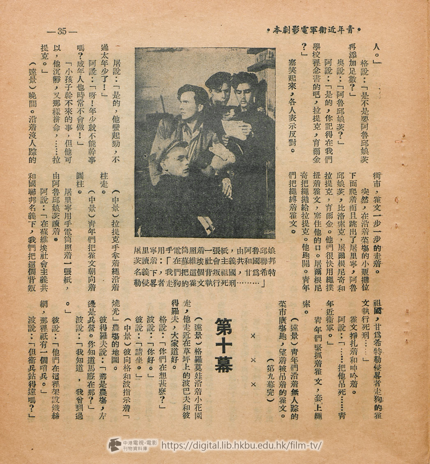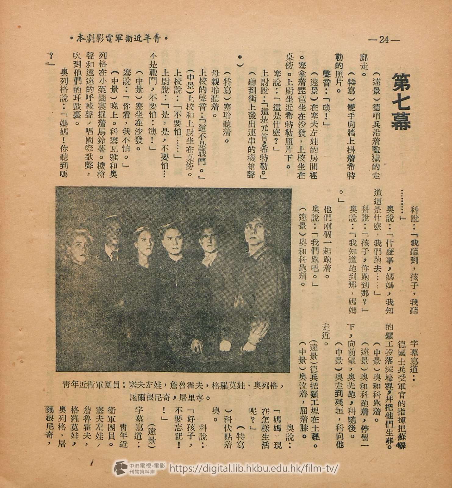 (中景)在密室裡聚集了一羣游擊隊員,他 門都圍着一個軍用無線電機,前面是布洛屠克。