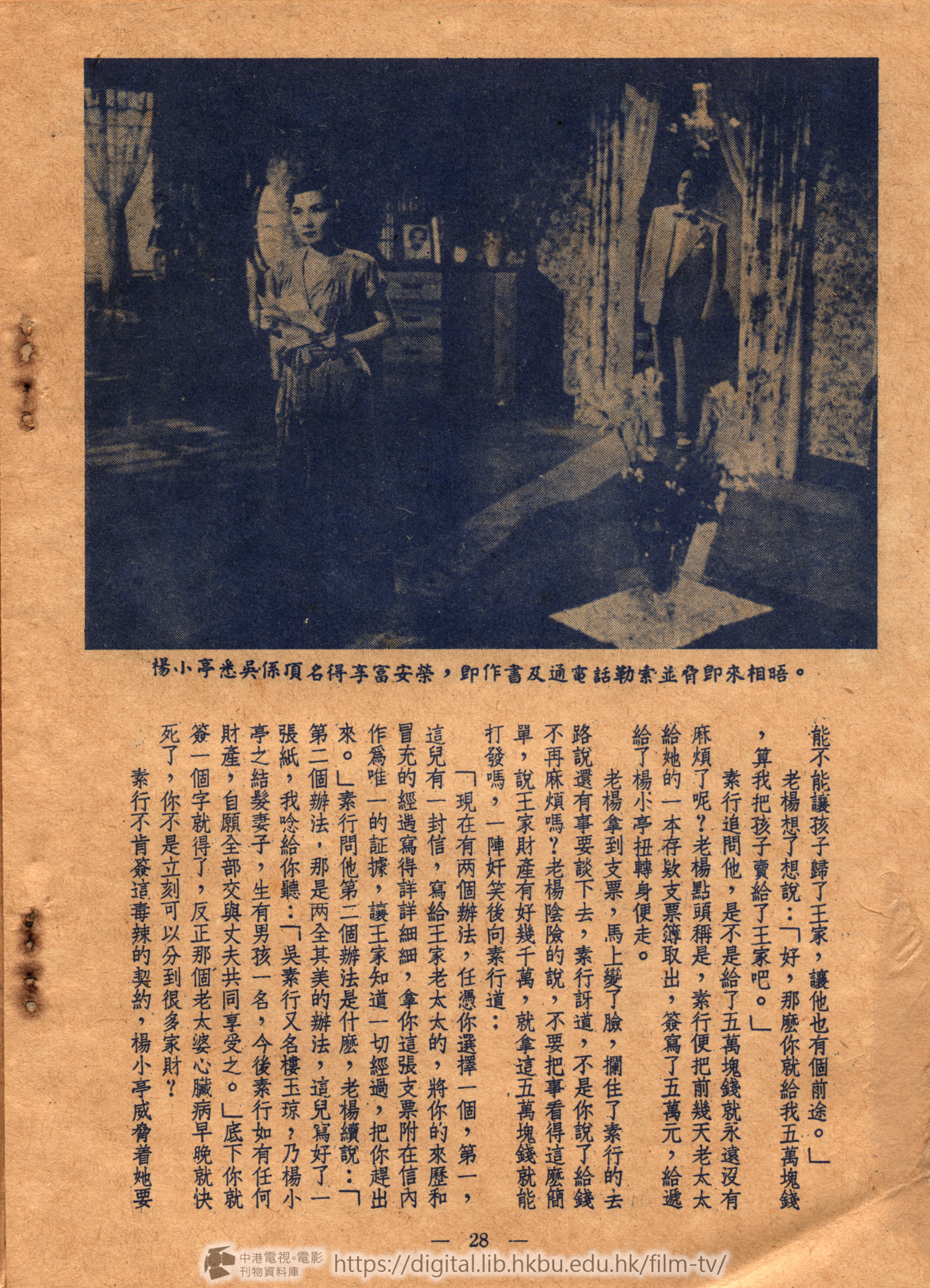 「現在有两個辦法,任憑你選擇一個,第一,這兒有一封信,寫給王家老太太的,將你的來歷和冒充的經遇寫得詳詳細細,拿你這張支票附在信內作爲唯一的証據,讓王家知道一切經過,把你趕出來。」素行問他第二個辦法是什麽,老楊續說:「第二個辦法,那是两全其美的辦法,這兒寫好了一張紙,我唸給你聽:「吳素行又名樓玉琼?乃楊小亭之結髮妻子,生有男孩一名,今後素行如有任何財產,自願全部交與丈夫共同享受之。」底下你就簽一個字就得了,反正那個老太婆心臟病早晚就快死了,你不是立刻可以分到很多家財?
