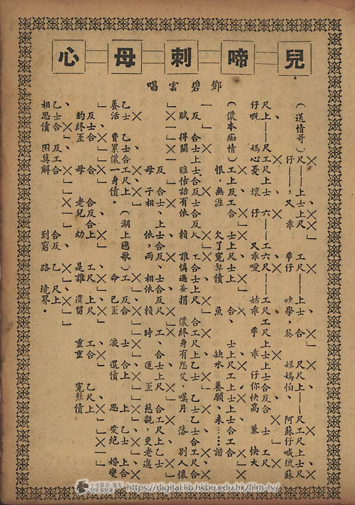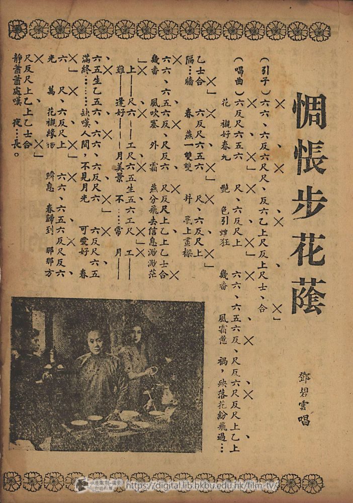 (唱曲)花 襯好春九 艷 色引蝶狂 幾番 風霜惹 禍,殃落花紛飛過…隔…牆 春 燕一雙雙 幷 飛上畫樑 幾番 風吹塞 外 霜 燕分飛去信息渺渺茫