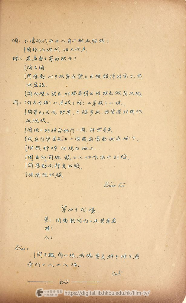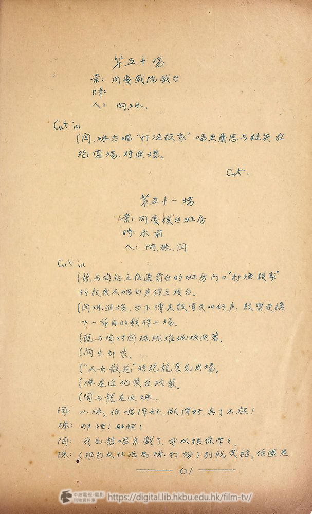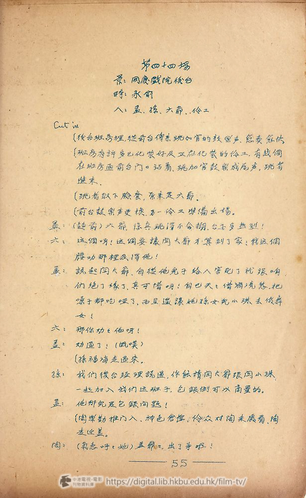 Cut in(班房裡有不少化粧好準備上戰的伶工,鼓樂声傳到後台,可以听到前台正在演戲。
