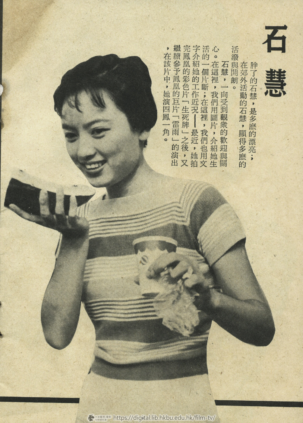 石慧,一向受到觀眾的歡迎與關心。在這裡,我們用圖片,介紹她生活的一個片斷;在這裡,我們也用文字介紹她的工作近況——最近,她拍完鳳凰的巨片「雷雨」的演出,在該片中,她演四鳳一角。